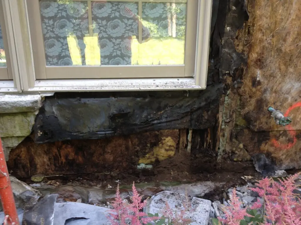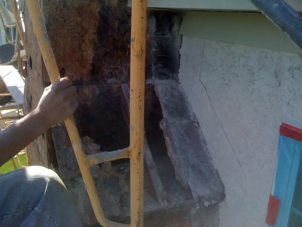 Water problems or rotted wood is created over the time because of continuous trapped moisture, this issues are caused by deficient window flashing and installation, inadequate installation of a water resistant barrier, lack of kick out flashing diverters, stucco installed below grade, this along with other factors are some of the common causes of most stucco and stone water damage.