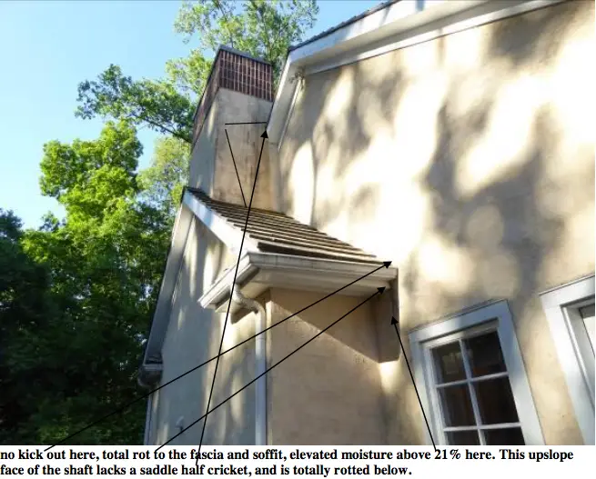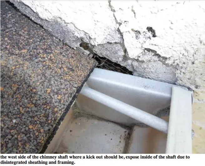 Is also the contractor’s duty to install a kick out flashing diverter at the lowest interior corner of the chimney hip/shoulder to diver the water out of the walls.