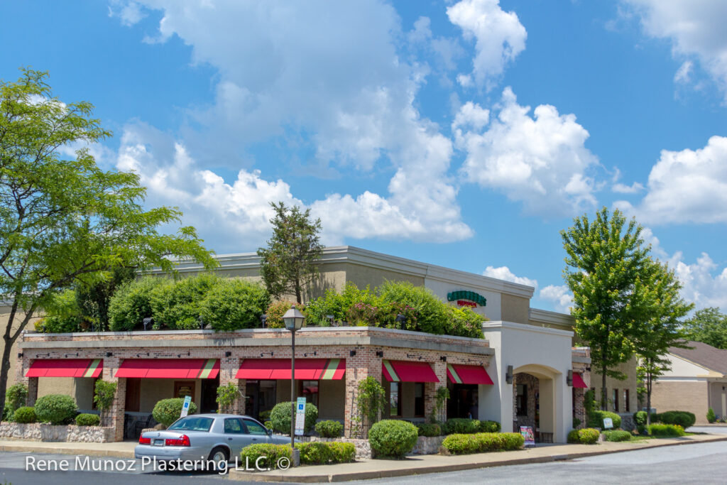 This beautiful restaurant features the installation of thin veneer manufacture stone and a 3 coat stucco system in both acrylic and cement plastering finish with custom EIFS detail trims, the over the roof garden makes this restaurant pop even when you are just driving by, it’s so invited, simply a great mix and a great sample of our capabilities as stucco and stone contractors.